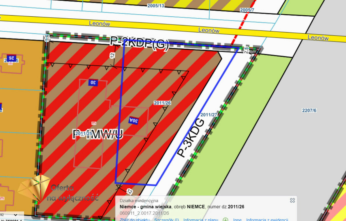 Oferta dostępna wyłącznie za pośrednictwem Franczewska Nieruchomości.Nieruchomość gruntowa o pow. 3398m2 w Leonowie, gm. Niemce pod zabudowę mieszkaniową wielorodzinną i usługową MW/U - rozumiane jako tereny, na których zlokalizowano zabudowę mieszkaniową wielorodzinną rozumianą zgodnie z przepisami odrębnymi i gdzie dopuszcza się usługi, zajmujące nie więcej niż 45% powierzchni całkowitej budynku mieszkalnego lub nie więcej niż 20% powierzchni działki lub terenu przeznaczonego pod zabudowę, w przypadku lokalizacji w odrębnym budynku usługowym, z urządzeniami towarzyszącymi oraz zielenią.