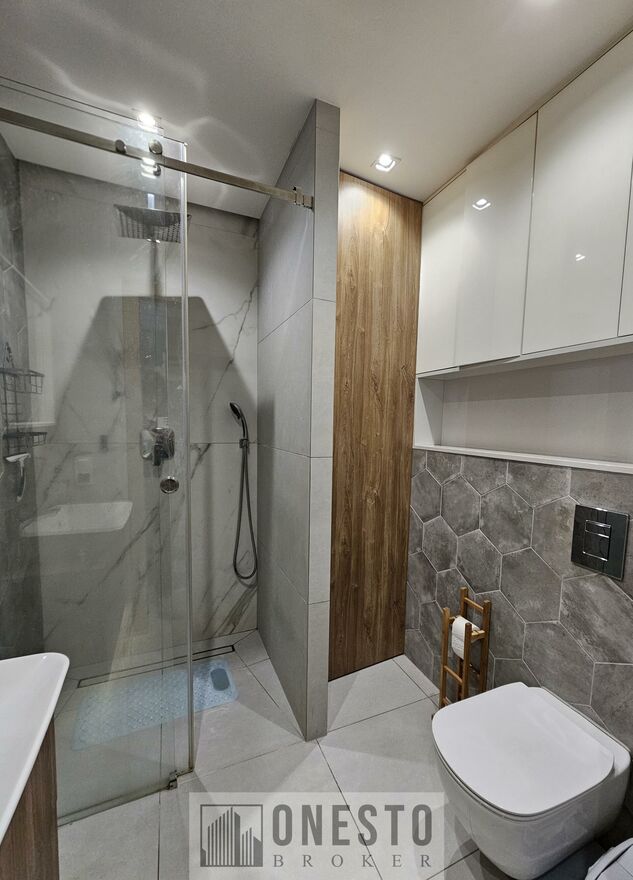 W łazience połączonej jest z WC znajdziemy prysznic, a także estetyczną zabudowę wraz z pralką.